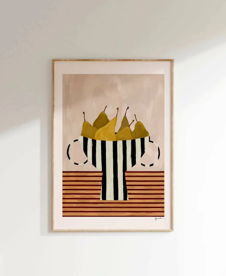 Pear Wall Art: I love this print - this still life illustration has a both a bold and organic quality, melding midcentury modern and contemporary feels. It helps tie in the other colors chosen in this kitchen - natural wood tones, black, greys and greens, rounding out the room and tying together the elements.