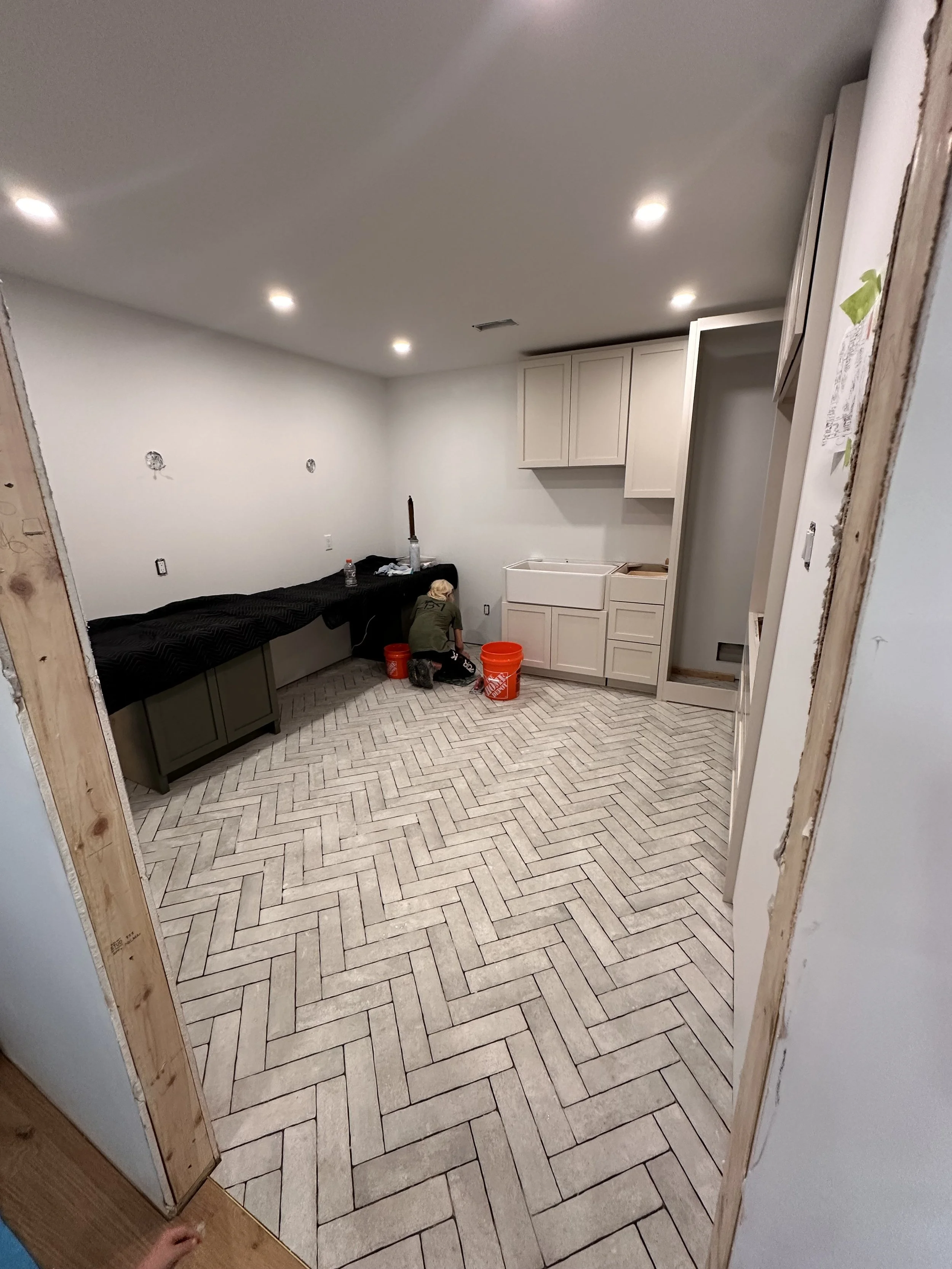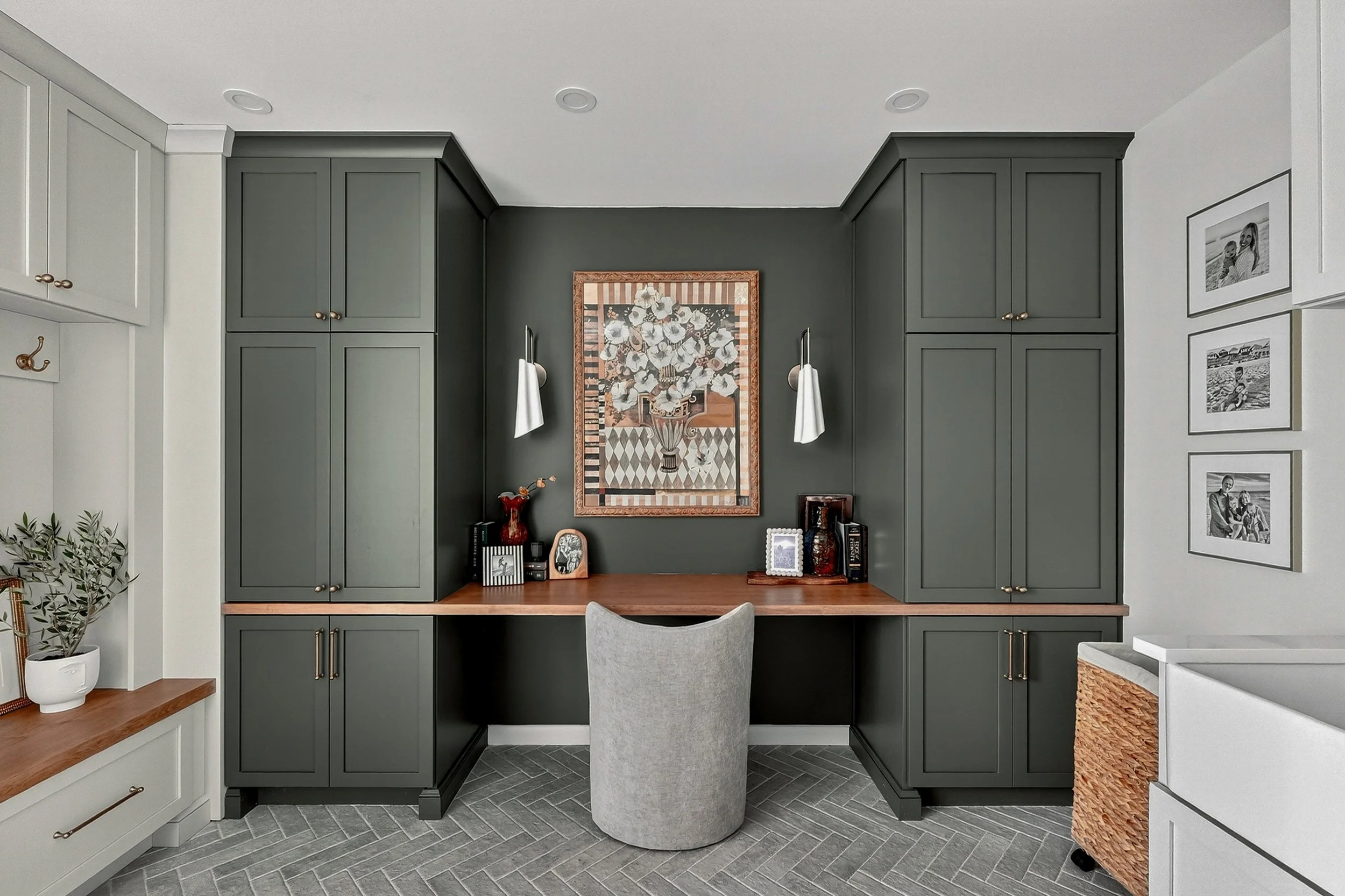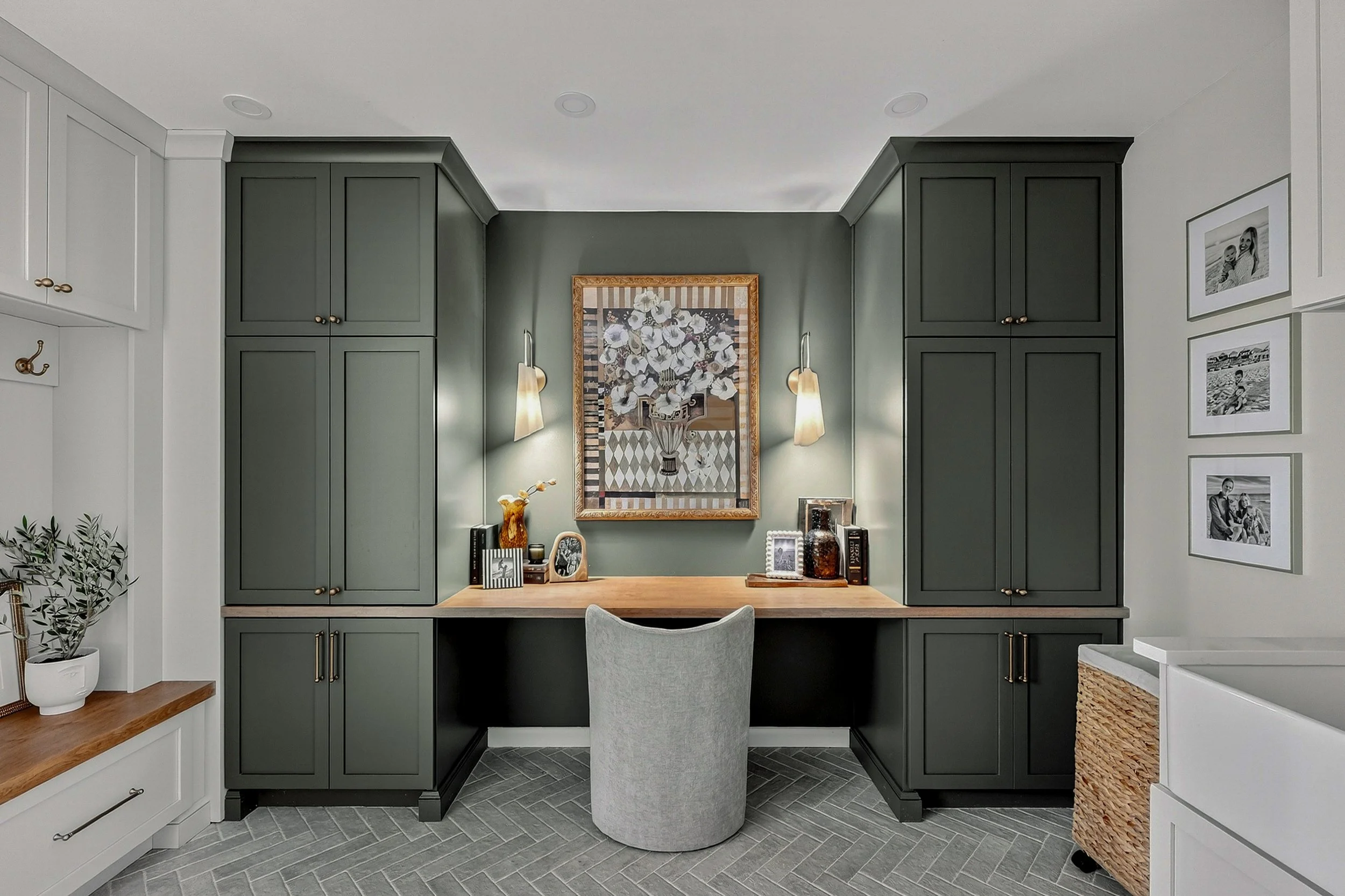 The design incorporates herringbone tile floors, setting a clean, organic foundation both beautiful and practical for everyday use. A spacious maple desk anchors the room, flanked by custom forest green cabinetry that brings depth and warmth. Every detail was considered for both utility and elegance — from the concealed printer drawer to the seamless built-in storage that keeps essentials close yet discreet.