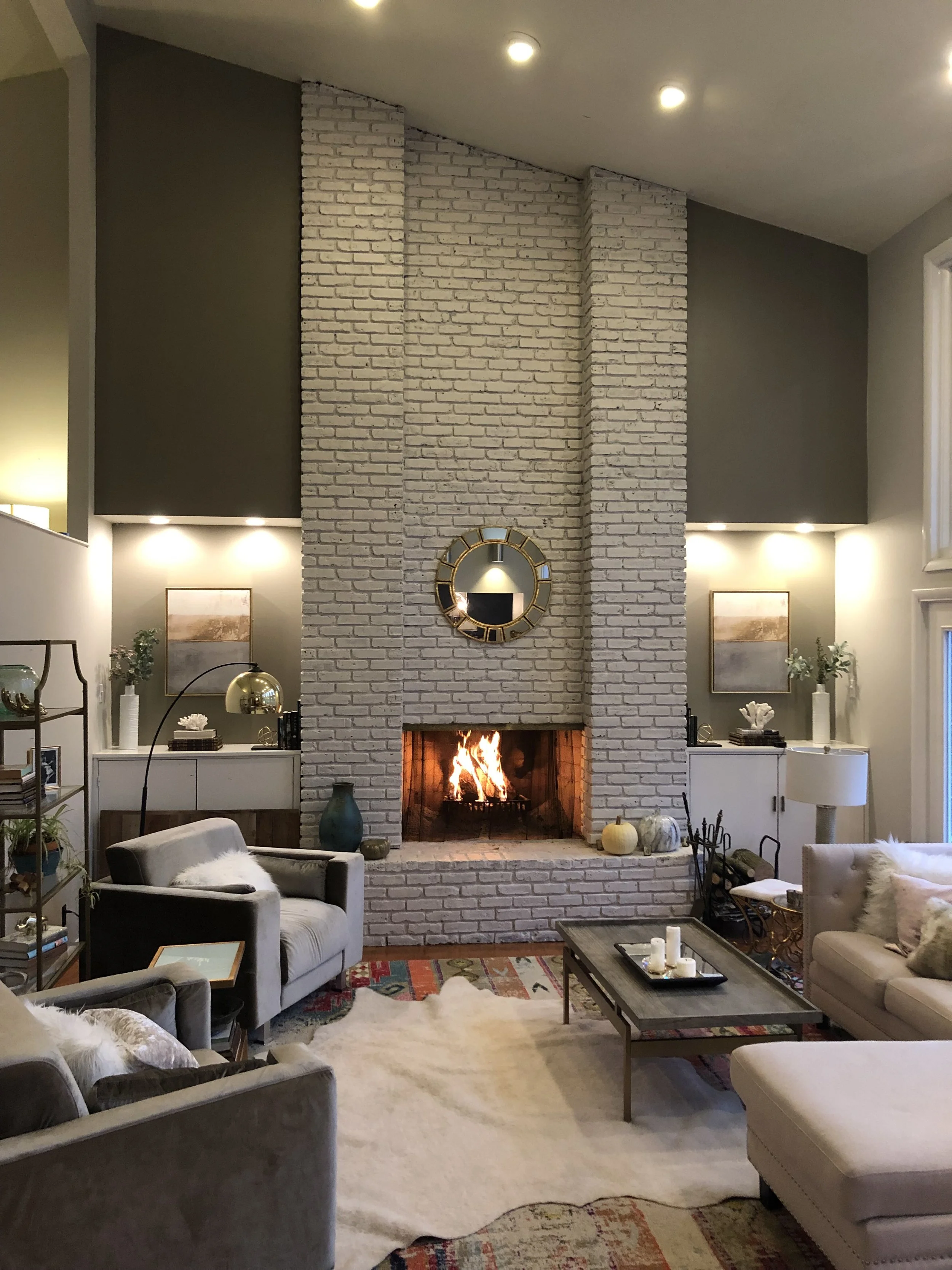 The two-story fireplace serves as a second focal point. Previously painted white, the brick was transformed using a German schmear technique, over-grouted to achieve a softer, more organic, stone-like finish. A custom wood mantel, finished in plaster, was added to introduce warmth and layered texture while guiding the eye upward through the vertical volume of the room.